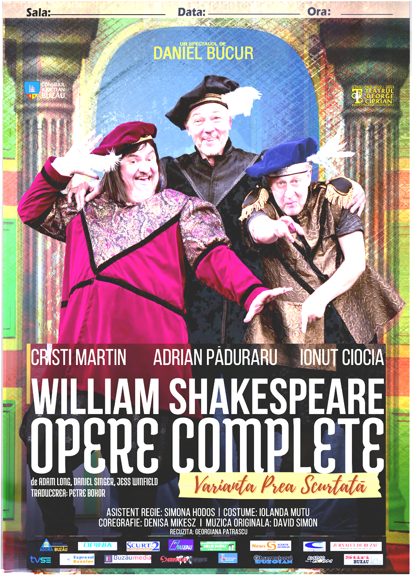 Buzoienii sunt invitați, duminică, 19 februarie, de la ora 18:00, la o nouă premieră a Teatrului „žGeorge Ciprian”. Este vorba despre piesa ,,William Shakespeare”“Opere Complete”“varianta prea scurtată”, o adaptare a regizorului Daniel Bucur. Noua premieră îi are ca protagoniști pe trei dintre cei mai cunoscuți actori ai scenei românești: Adrian Păduraru, cunoscut în filmele de succes „Declarație de dragoste” și „Liceenii”; Ion Ionuț Ciocia, actorul care îl interpretează pe Brânzoi, în serialul „žLas Fierbinți” și Cristi Martin, duhul lămpii, din piesa ,,Lampa lui Aladdin”, o altă premieră a Teatrului „žGeorge…